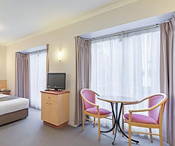 The ideal choice for the whole family to stay together. This spacious room has a comfortable king-sized bed, a separate sitting room with 2 single beds, a bathroom with a bathtub and shower overhead, and all the modern amenities you need. Rates for 4 persons. 5th person, extra cost applies for a rollaway bed.
